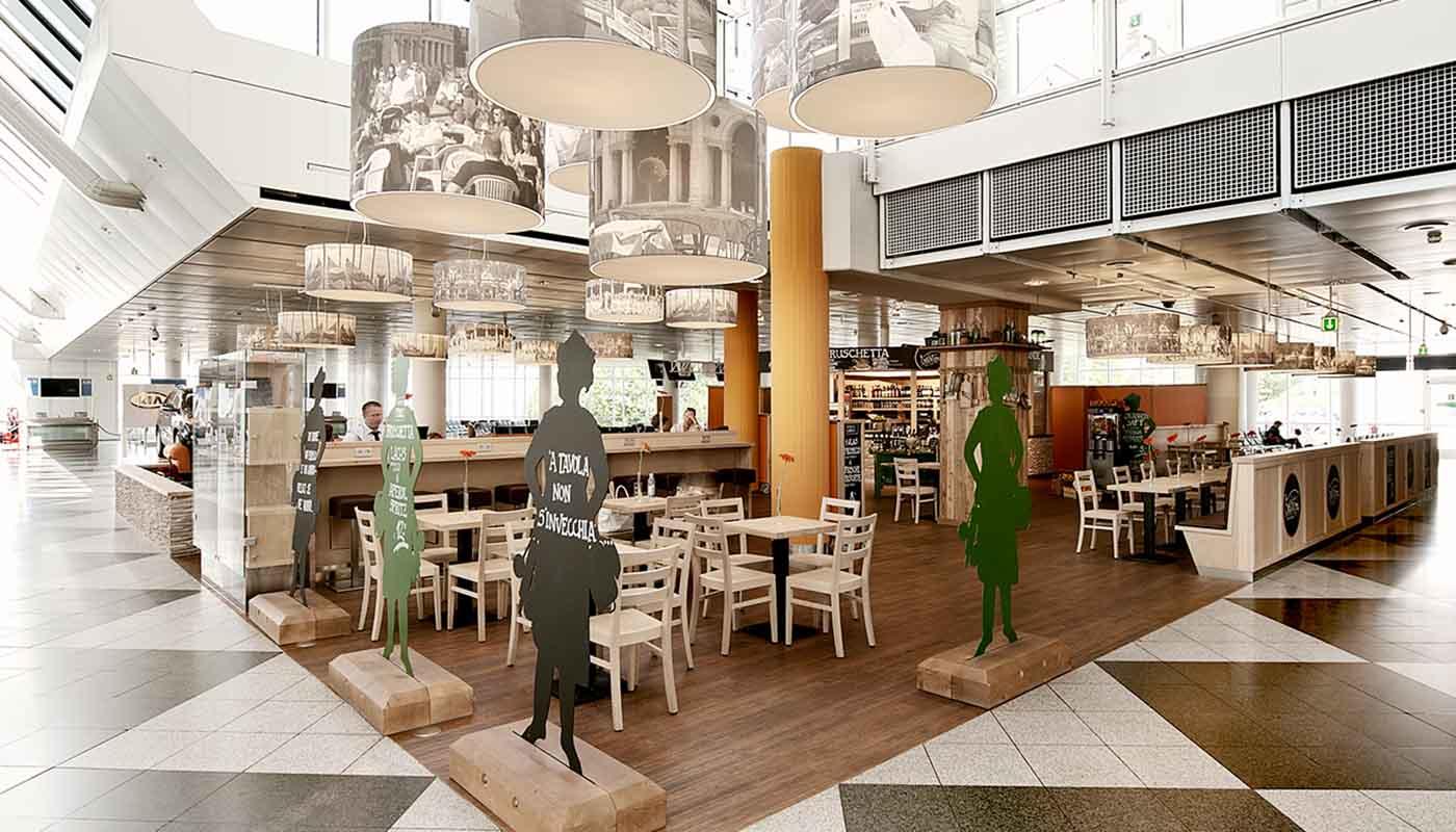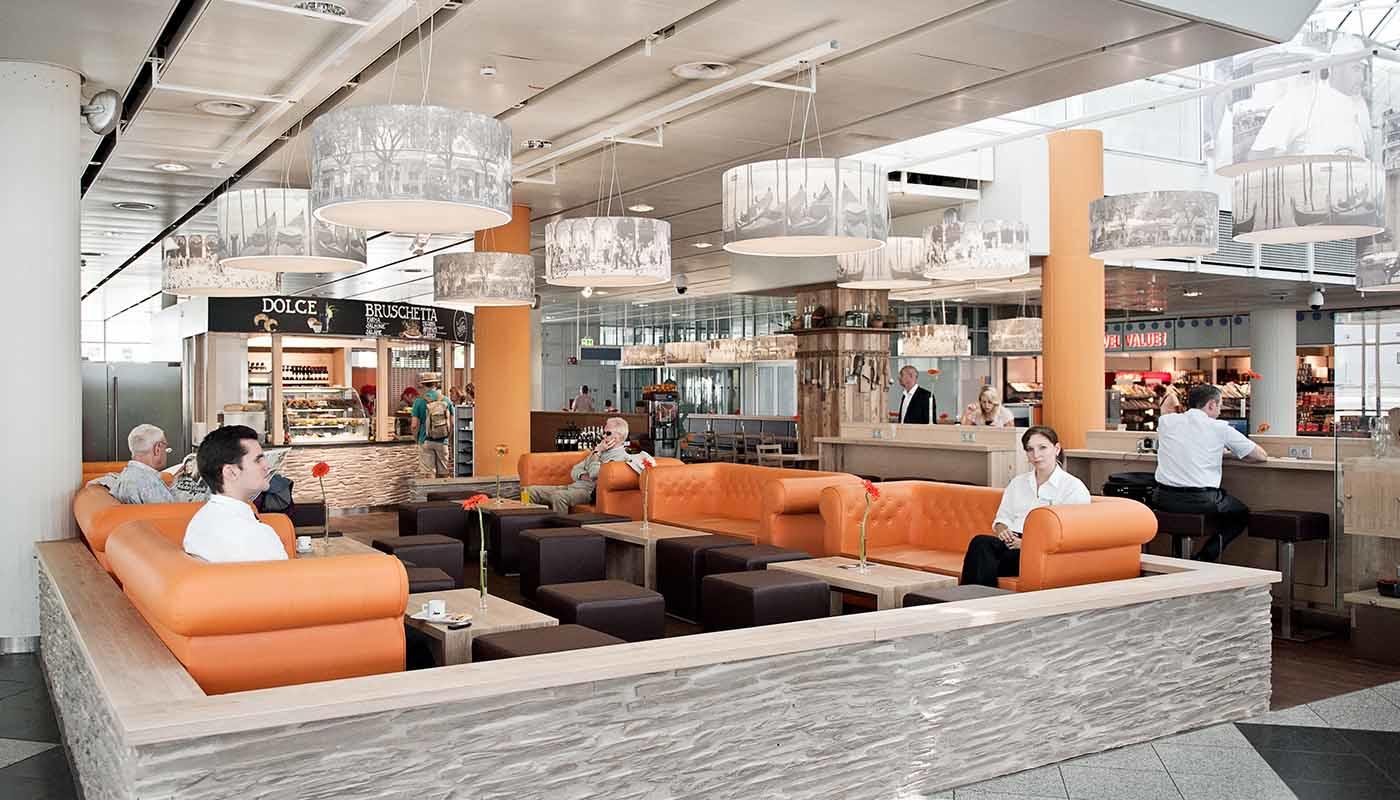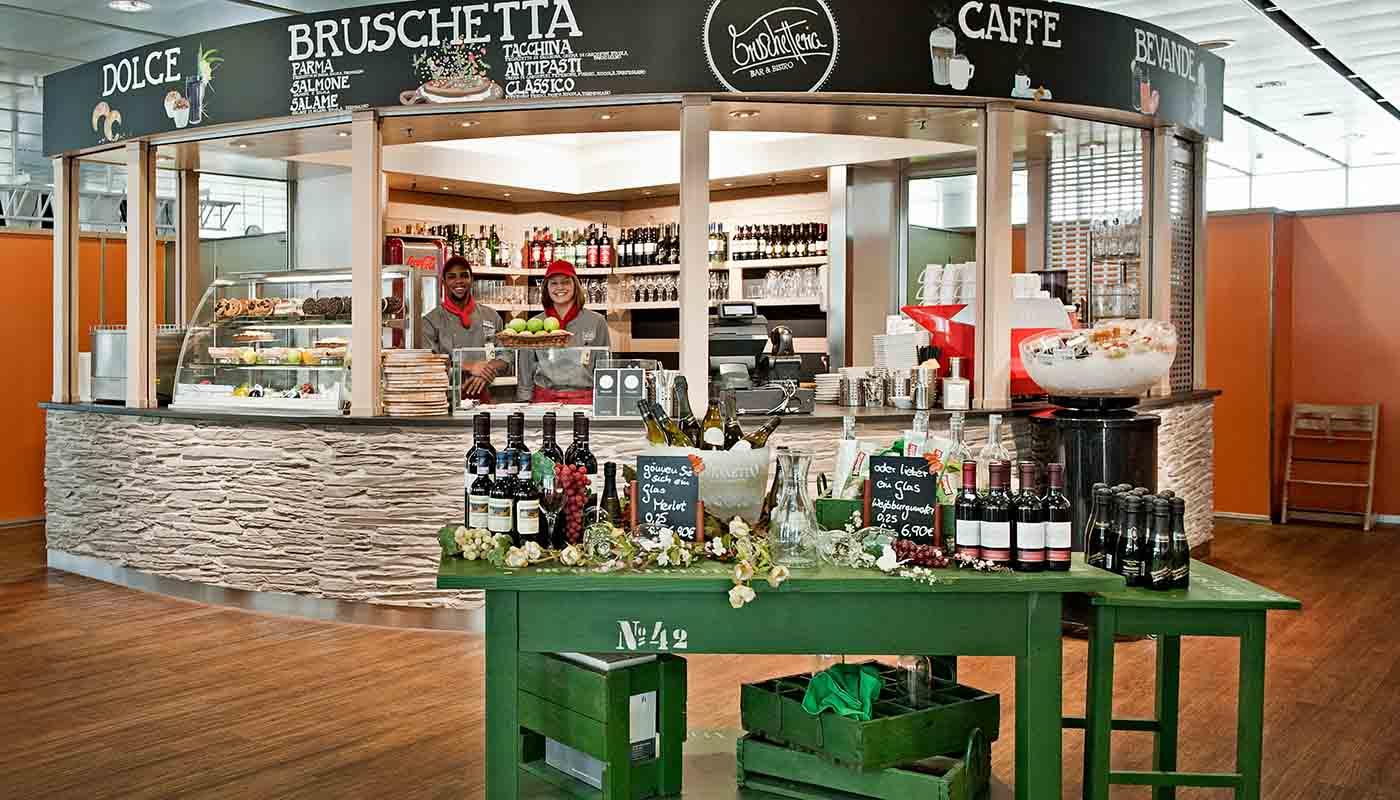 Any time left till departure? The Bruschetteria with typical Italian specialities is the ideal place to shorten your waiting time. A delicious espresso or a traditional bruschetta with Parma ham will make your time fly by. Relax in the cosy lounge area or use the business seats.