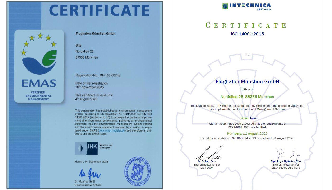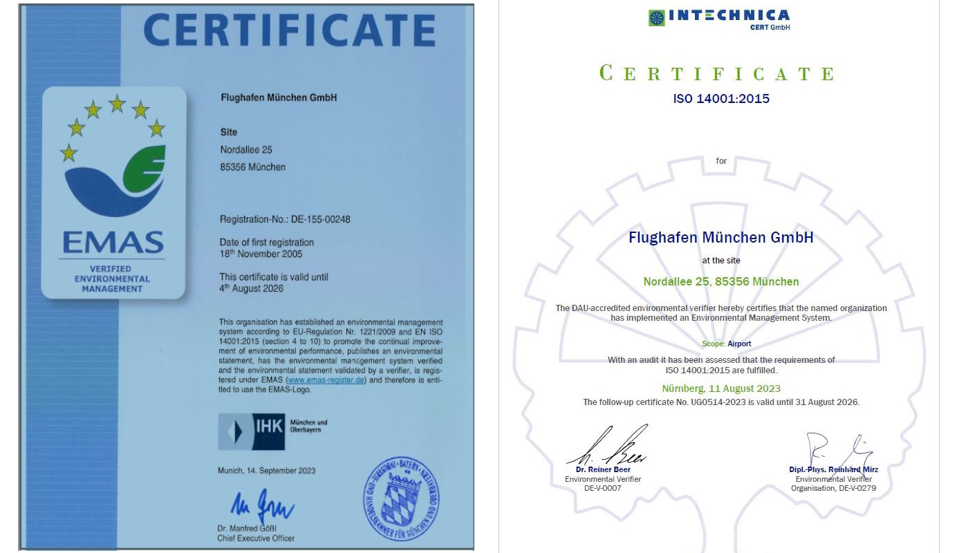 Flughafen München GmbH (FMG) received a gold award from the "Bavarian Environmental and Climate Pact" in 2023 in recognition of its long-standing commitment to environmentally friendly development.