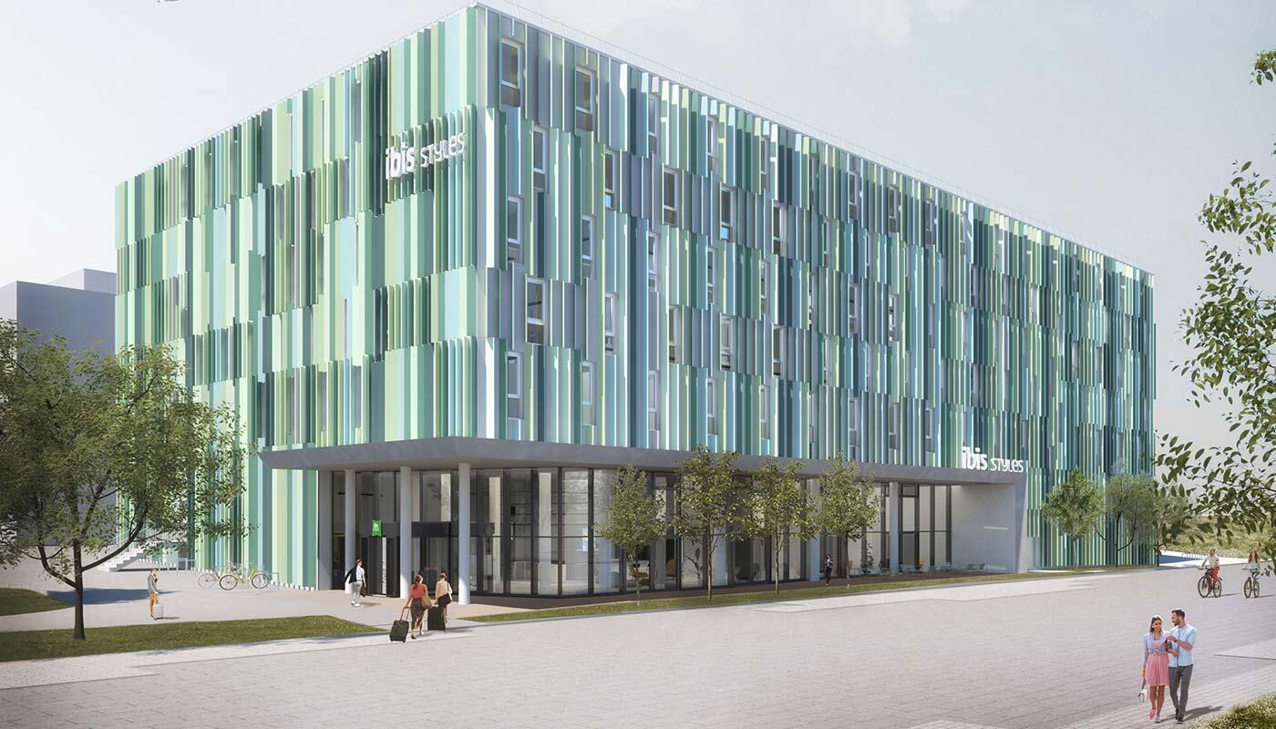 • Rendering Ibis Styles Hotel at Munich Airport: South of the Novotel, a third hotel is being built on the airport site. © Architekt Consult ZT GmbH