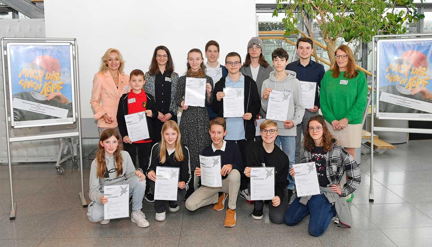 Die 25-köpfige Jury – Expertinnen und Experten aus den jeweiligen Fachgebieten – ermittelten folgende Sieger (hintere Reihe von links nach rechts): Simon Remmele (Physik, Schyren-Gymnasium Pfaffenhofen), Vincent Engelbrecht (Technik, Katharinen-Gymnasium Ingolstadt), Alexander Hutanu (Biologie, Werner-Heisenberg-Gymnasium Garching). Mittlere Reihe von links nach rechts: Benedikt Siewert (Biologie, Katharinen-Gymnasium Ingolstadt), Sofia Ulrich (Geo- und Raumwissenschaften, Schyren-Gymnasium Pfaffenhofen), Sebastian Siewert (Biologie, Katharinen-Gymnasium Ingolstadt), Stefanos Koufogazos Loukianov (Arbeitswelt, Gymnasium Ismaning). Untere Reihe von links nach rechts: Luisa Heumann (Arbeitswelt, Gymnasium Ismaning), Greta Venus (Arbeitswelt, Gymnasium Ismaning), Alexander Schmid (Technik, Tilly-Realschule Ingolstadt), Timo Link (Technik, Tilly-Realschule Ingolstadt) und Raphael-Desmond Gherdan (Technik, Tilly-Realschule Ingolstadt).