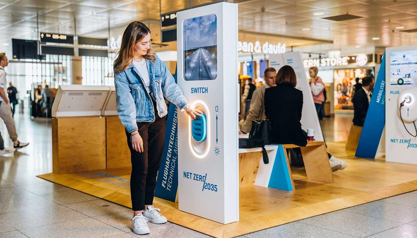 Vier interaktive Stationen der "Erlebnisfläche Net Zero" beleuchten die wesentlichen Handlungsfelder des Flughafens: von technologischen Innovationen bei den flughafentechnischen Anlagen über die Umstellung des Fuhrparks auf elektrische Antriebe, den nachhaltigeren Bau und die energetische Verbesserung bestehender Immobilien bis hin zur Energiewende mit einem massiven Ausbau der Photovoltaik. Ein großer Touchscreen informiert über die Möglichkeiten zur Reduzierung der letzten zehn Prozent der Emissionen. Dies schließt das Konzept des "Removals" ein, bei dem CO2 aktiv aus der Atmosphäre entfernt wird.