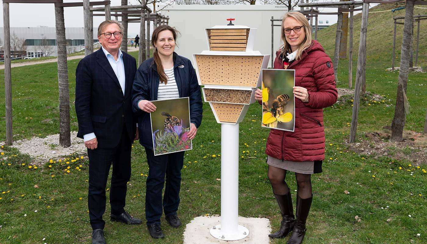 Auch für Insekten gibt es ab sofort ein Hotel am Münchner Airport. Dr. Michael Kerkloh, Vorsitzender der Geschäftsführung der Flughafen München GmbH (FMG) eröffnete das neue "Insektenhotel" zusammen mit Eva Seifert (Mitte) und Julia Gotzler aus der Umweltschutzabteilung der FMG, die das Projekt initiiert hatten. Wildbienen, Grabwespen, Florfliegen und andere geflügelte Gäste finden in dem als Flughafentower gestalteten Quartier artgerechte Überwinterungs- und Nistmöglichkeiten. Durch das vom Volksbegehren „Rettet die Bienen“ inspirierte Projekt will der Flughafen, der mit seinen extensiv gepflegten, blütenreichen Wiesen Lebensraum zahlreicher Insekten ist, einen weiteren Beitrag zur Stärkung der Artenvielfalt auf dem Flughafengelände leisten. Auch mit einem vergleichsweise kleinen Schritt wie der Eröffnung solcher Insektenhotels mache der Airport deutlich, so Flughafenchef Kerkloh, "dass sein Selbstverständnis als grüner Flughafen deutlich mehr als ein Lippenbekenntnis ist".