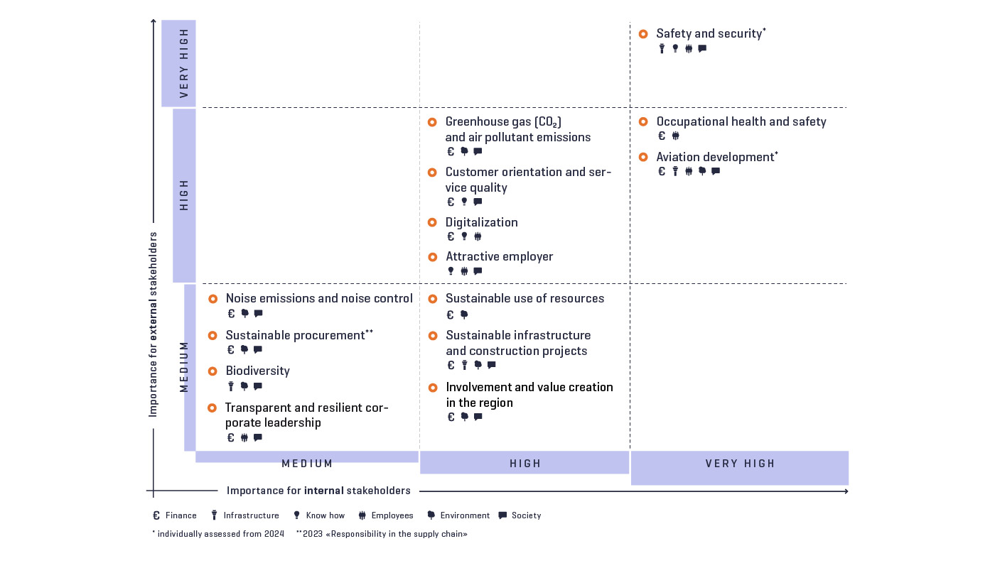 The material topics for Munich Airport were determined based on a materiality analysis. Munich Airport's management approaches follow the requirements of the GRI Standards presented in the GRI Content Index.
